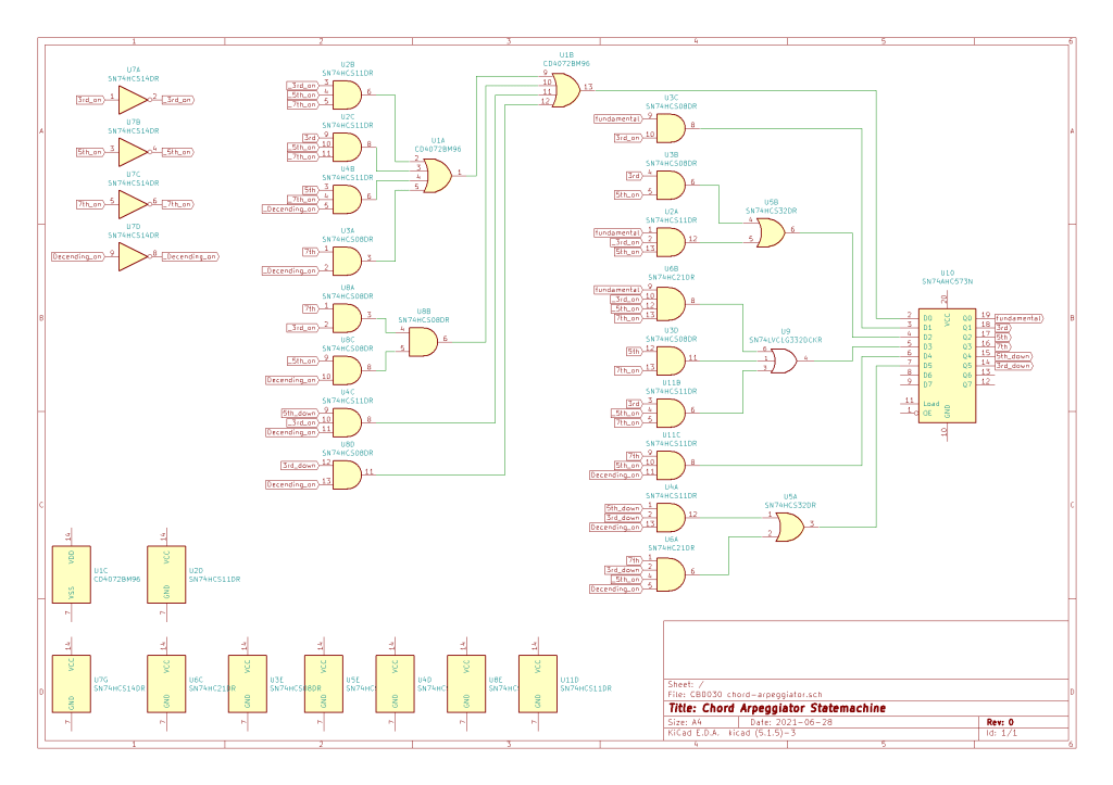 Previously in part 1 we diagramed a state machine to represent a chord arpeggio. In part 2 we determined what the sum of products would be for the state transition logic, and simulated the logic. Now it’s time for the next step which is to look at the physical implementation. I spent some time KiCAD and came up with this lovely schematic.